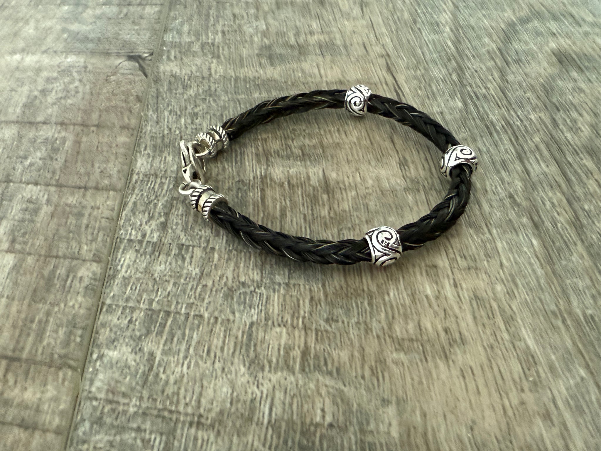 4mm braided bracelet with a sterling silver lobster clasp and 3 sterling silver beads and end caps. .