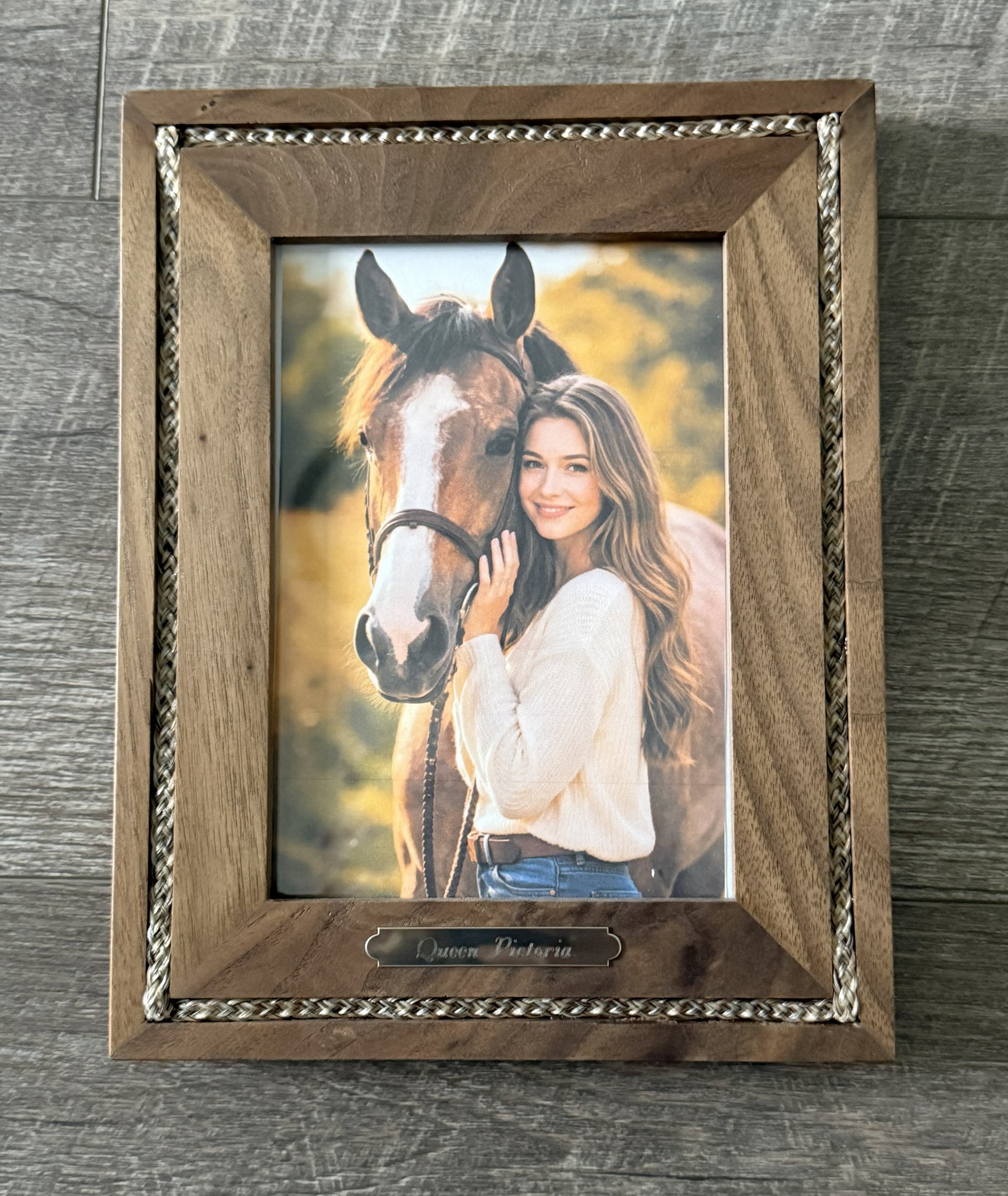 Picture frames with a braid of horsehair all the way around the frame. Can be ordered in 4x6, 5x7 or 8x10. All frames can be used vertically or horizontally. Please specify which way frame is to be used if adding a nameplate. Nameplate options are 1 ¾ inch, 2 ½ inch, or 3 inch in brass and silver. Font styles are Victoria, Block, Roman, or Script